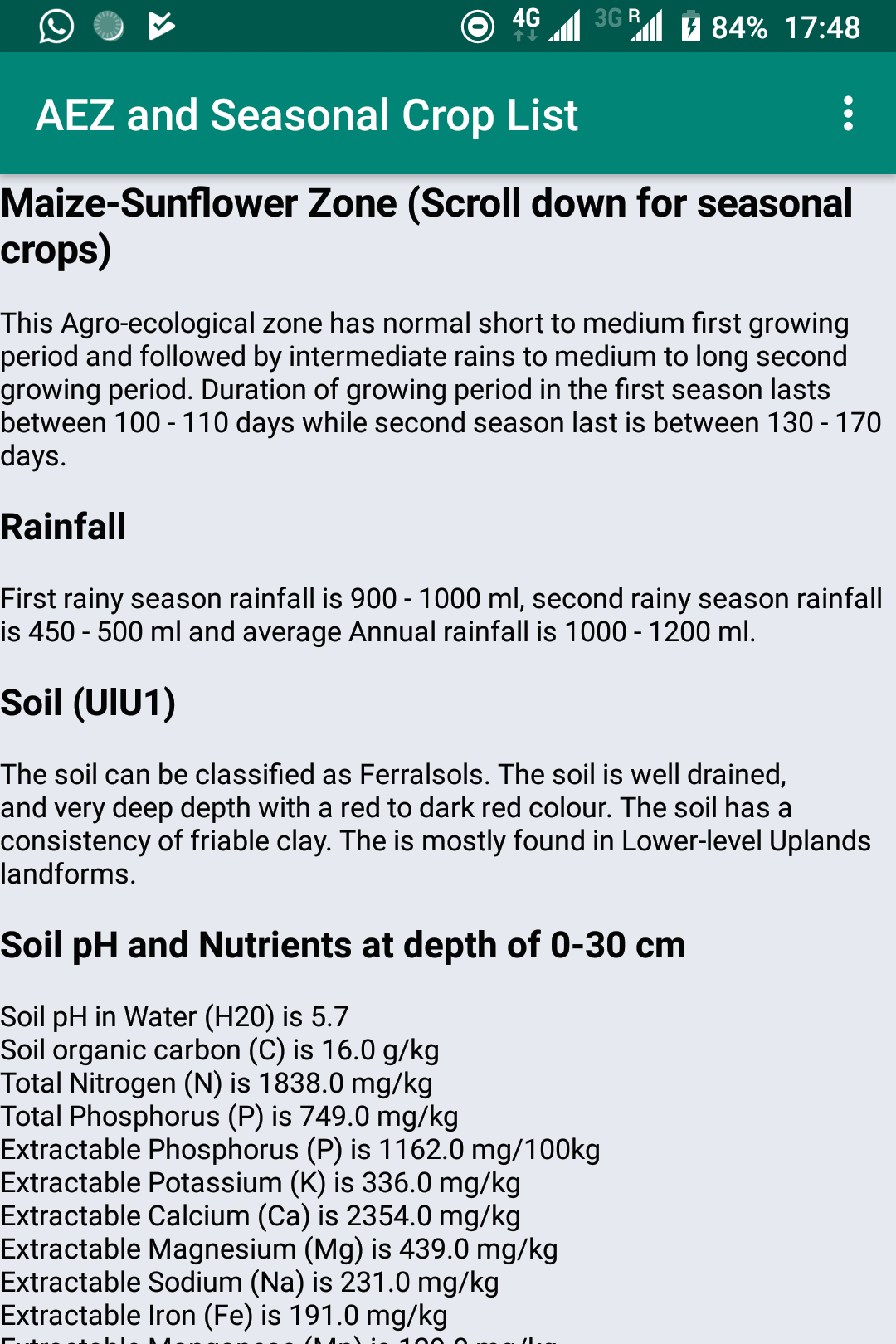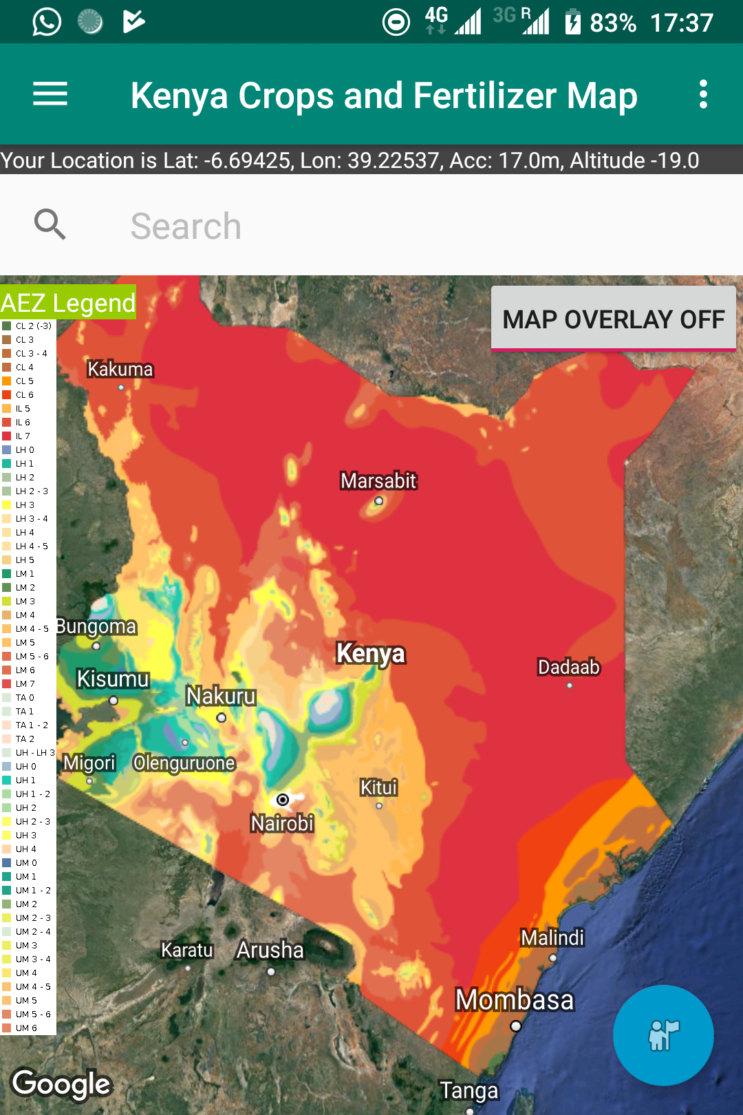 This app will enable you to identify the right crop for the right place. It gives information on Agroecological zones, average seasonal rainfall, crop varieties and types, general soil information, predicted soil pH and soil nutrient necessary for crop growth. It is based on Farm Management Handbook of Kenya